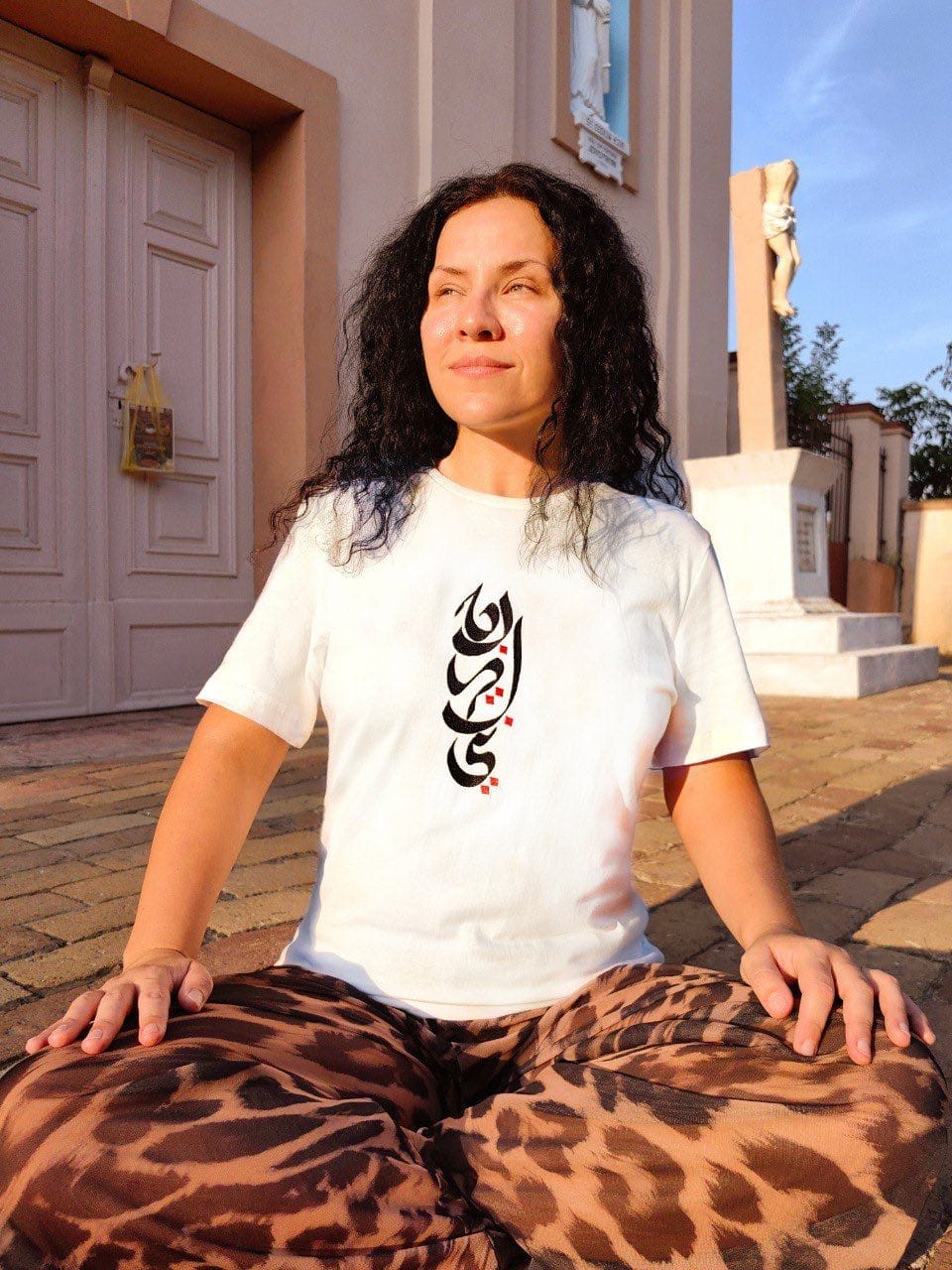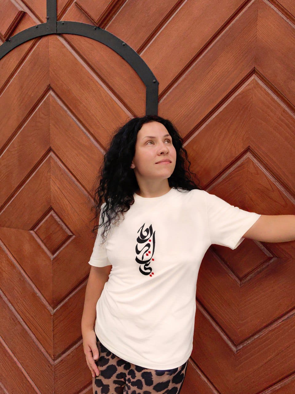 Футболка легко сочетается с джинсами, льняными брюками или юбкой. Она подойдёт и для утреннего кофе на балконе, и для прогулки по рынку в Триполи, и для офисного дня, где хочется чуть-чуть личного и живого.