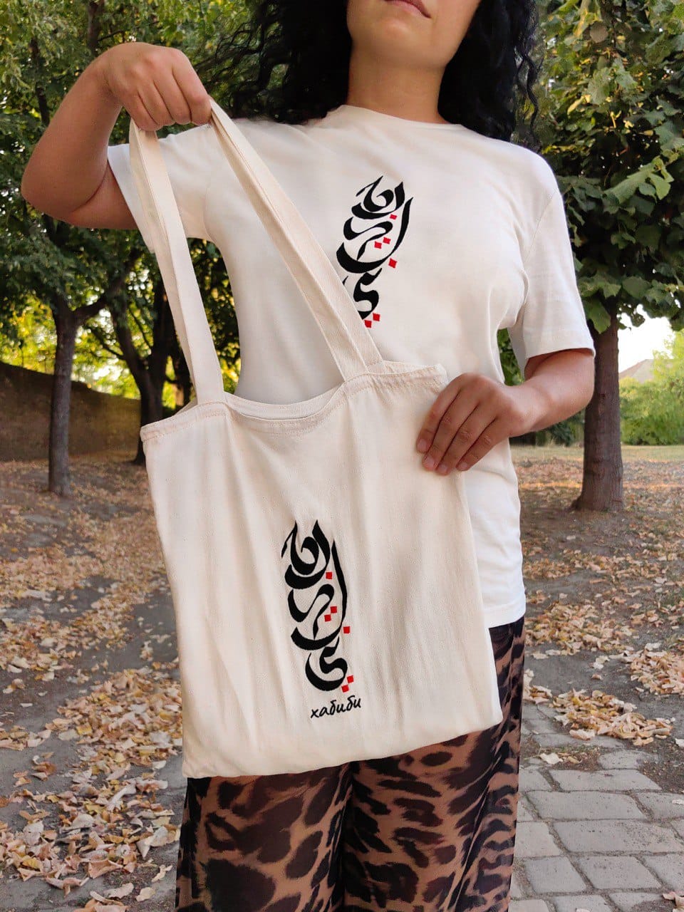 На этом шопере — тонкая вышивка «Хабиби», выполненная в арабской каллиграфии. Линии мягкие, текучие, как движение кисти по песку. Это слово означает «любимый» — нежное, как голос на рассвете, и тёплое, как хлеб с заатаром, только что из печи.